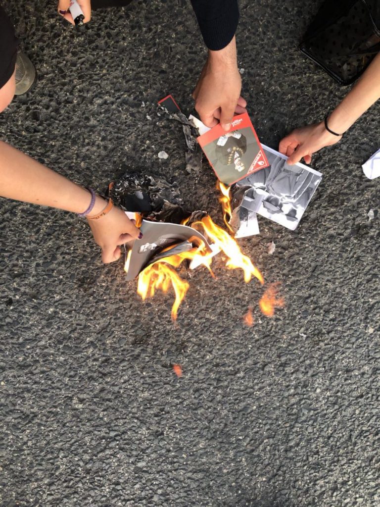 Durant tot el recorregut es van cridar consignes a favor d’uns Països Catalans lliures, socialistes, anticapitalistes, antifeixistes i feministes. També hi va haver càntics contra la repressió, per la solidaritat i per la llibertat dels presos polítics, reivindicant que els carrers seran sempre nostres i que l’únic terrorista és l’Estat capitalista. Al Pont del Real s’hi va fer l’acció simbòlica de la crema d’unes fotos gegants dels reis espanyols per palesar que arreu dels Països Catalans no tenim ni rei ni por.